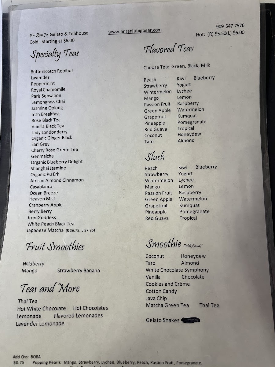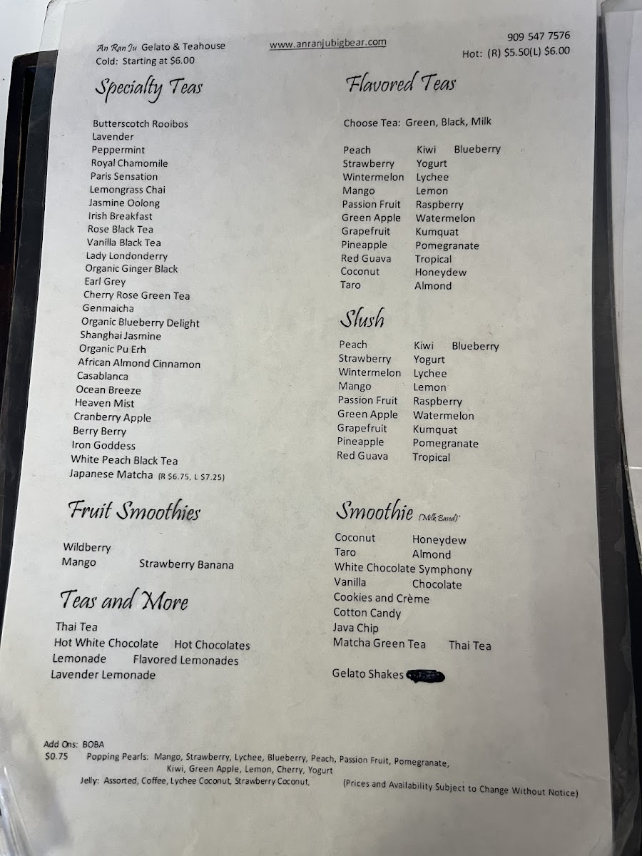 The menu at An Ran Ju 安然居 Gelato & Teahouse features a selection of bubble teas and gelato varieties, suitable for casual visits, quick orders, or light refreshments during the day. Visitors can find both hot and iced tea options, with choices that include specialty blends and sugar-free sweetening alternatives.